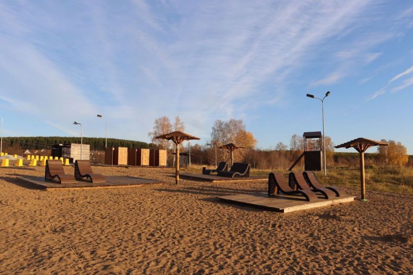 Рабочие устанавливают малые архитектурные формы, скоро приступят к монтажу скамеек, урн, кабинок для переодевания, шезлонгов и зонтиков. Также на пляже появится спасательная вышка, а также беседки, мангальные зоны и пешеходный мост.