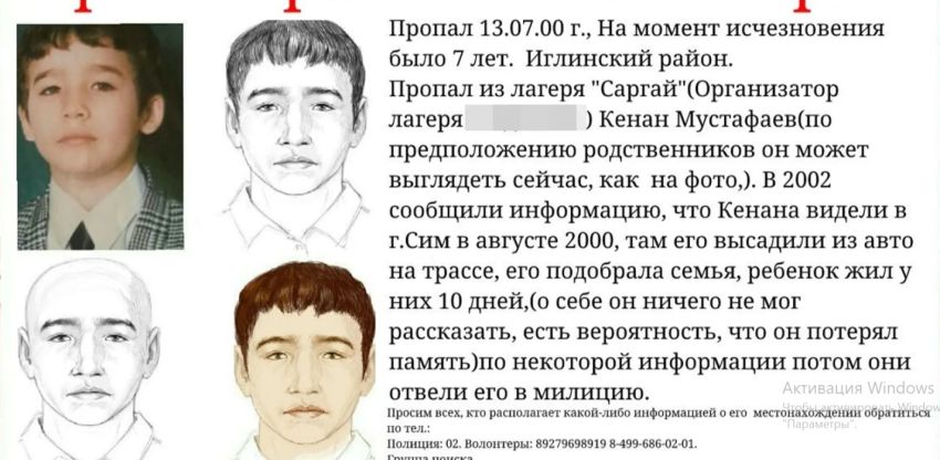 Трагический случай произошел в 13 июля 2000 года в Иглинском районе. Семилетний Кенан Мустафаев из Белебея пропал из лагеря «Саргай». Долгие годы родители пытались самостоятельно найти сына, в поисках участвовали полицейские, волонтеры, журналисты и даже экстрасенсы.