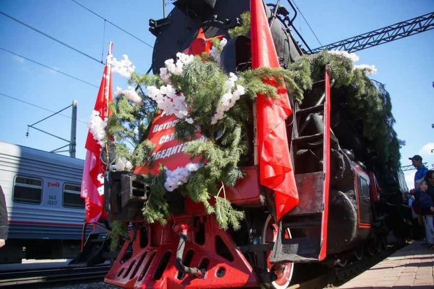 В состав ретро-поезда входят 11 платформ с уникальными экспонатами военного времени и специальные вагоны для акции «Бессмертный полк». Состав поведет знаменитый паровоз «Лебедянка», стилизованный под победный май 1945 года.